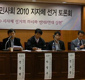 2010선거연합에 대한 야권과 시민사회 고민 내년 6월 2일에 지방선거가 있습니다. 지난 재보선을 이후로 선거연합 논의가 본격적으로 시작됐습니다. 여러 연대체가 꾸려지고 있습니다. 단체별, 당별로 민주대연합, 진보대연합, 선거연합, 독자노선 등 논의가 활발합니다. 경남에서도 시작됐습니다. 야권과 시민사회세력의 선거연합에 대한 생각을 들어봤습니다. 지난 11월 11일 경남지역 토론회에서 나온 각자의 고민들입니다. 2010 지방선거에서 도내 야권과 시민사회세력이 '반MB, 반한나라당' 후보단일화 논의를 시작했다. (관련기사☞ 재보선, 내년 지방선거 선거연합 깃발 오르나) 11일 오후 창원대 사회과학대 모의법정실에 경남지역 시민사회단체와 자치분권전국연대, 민주당과 민주노동당, 창당을 추진 중인 국민참여당 관계자가 한자리에 모여 내년 지방선거 토론회를 했.. 더보기